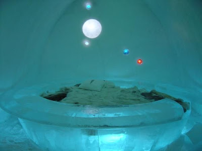 Images of rooms built of ice inside The Ice Hotel in Jukkasjarvi in the furthest north of Sweden. The Ice Hotel is an actual hotel and reservations are around 200 Euros per night, it is a very beautiful and popular hotel where residents usually stay for one night. The temperature in the rooms are around 6 degrees minus (Celcius) and the guests are provided with very warm sleeping bags. The breakfast is very luxurious.